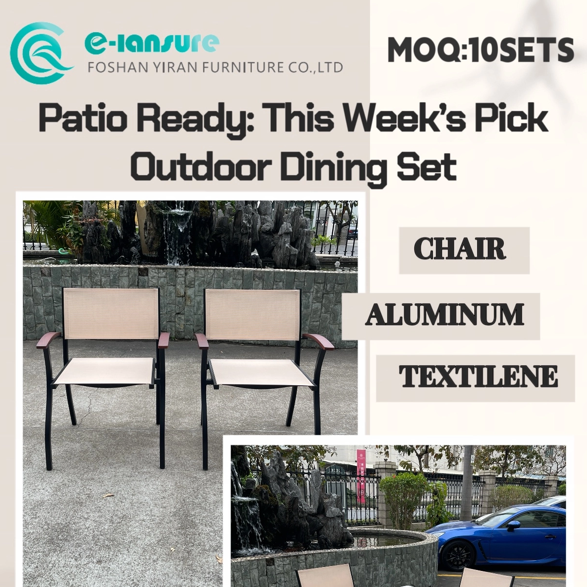 As part of this week's featured promotion, this outdoor dining set is available with a minimum order quantity of 10 sets, making it suitable for small projects, new restaurant openings, or outdoor area upgrades.