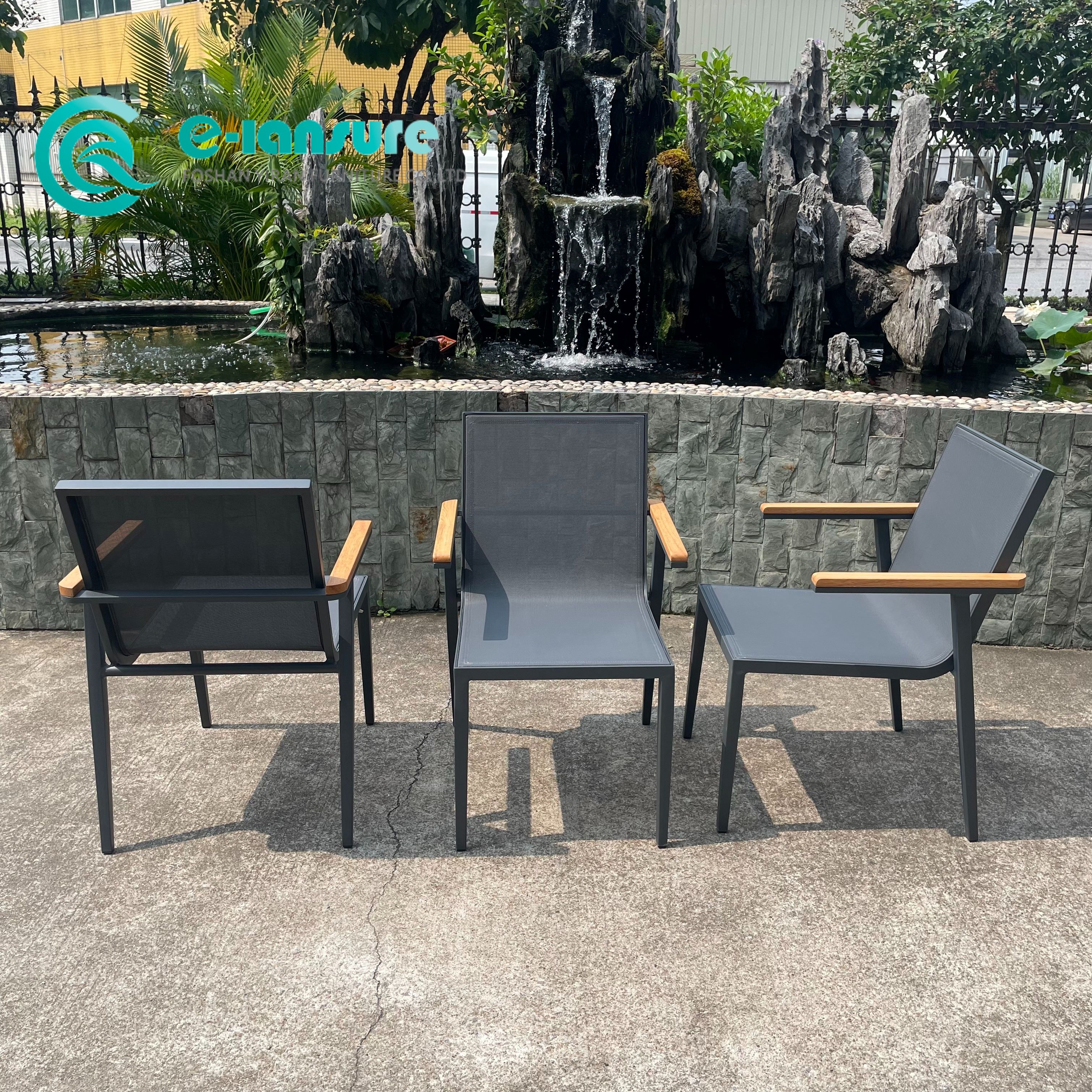 ቀላል ዘይቤ የአሉሚኒየም የውጪ ዕቃዎች: ሁሉም የአየር ሁኔታ ጨርቅ የመመገቢያ ወንበር ከእንጨት ክንድ ጋር