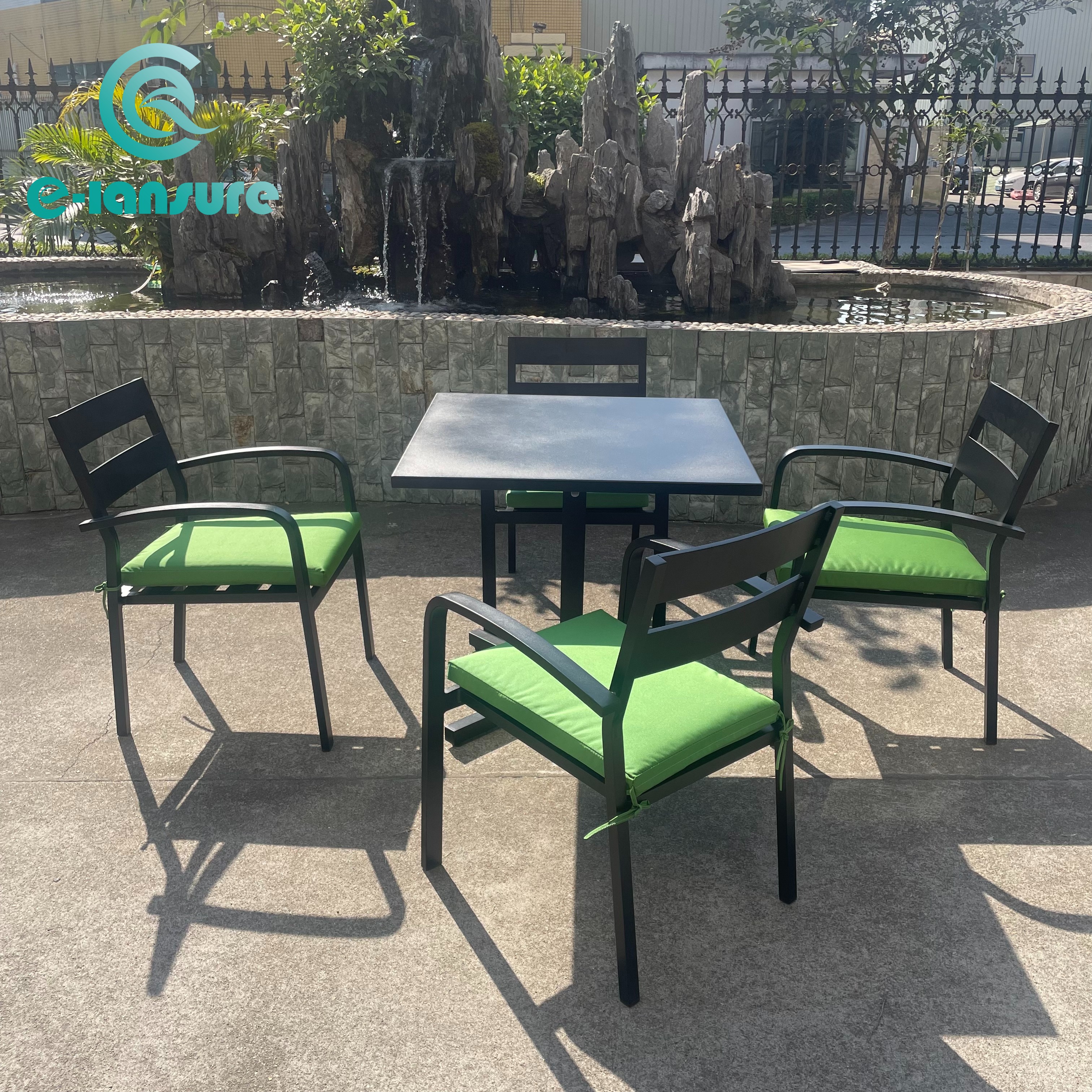 Σας παρουσιάζουμε το σετ επίπλων τραπεζαρίας εξωτερικού χώρου, κατασκευασμένο με ανθεκτικό πλαίσιο αλουμινίου και σχεδιασμένο για να αναδεικνύει την ατμόσφαιρα οποιουδήποτε εξωτερικού εστιατορίου. Αυτό το σετ περιλαμβάνει μια κομψή μαύρη καρέκλα τραπεζαρίας με ασορτί τραπέζι, παρέχοντας στυλ και λειτουργικότητα στον εξωτερικό χώρο της τραπεζαρίας σας.