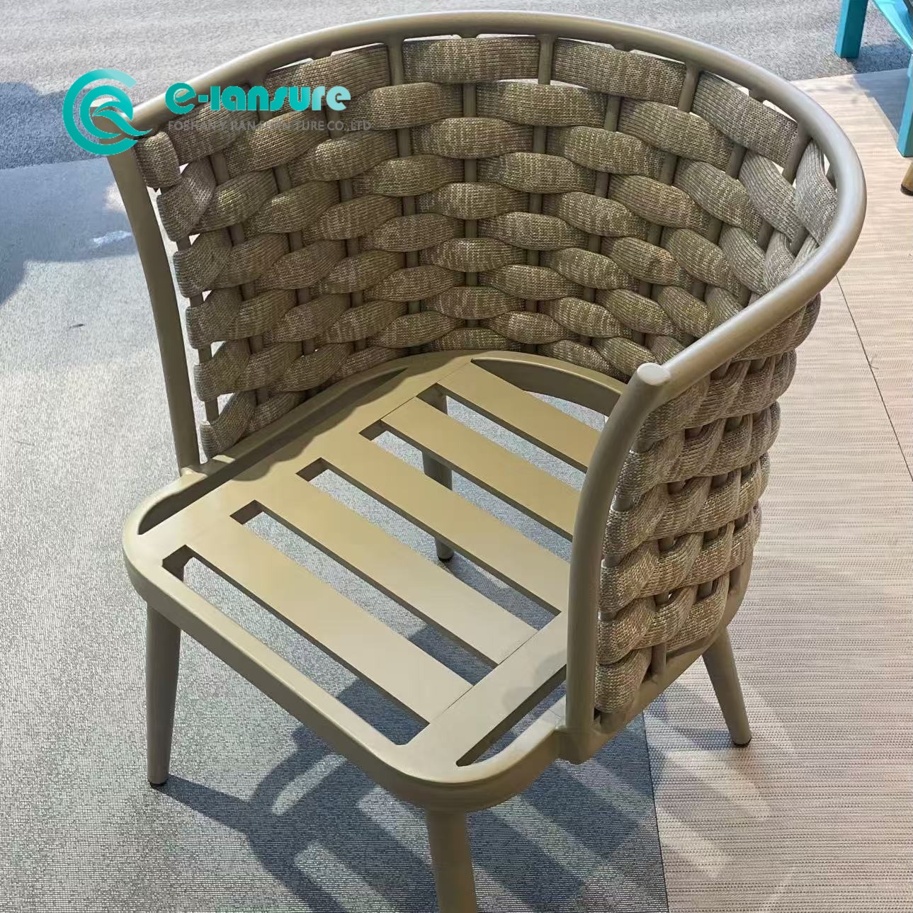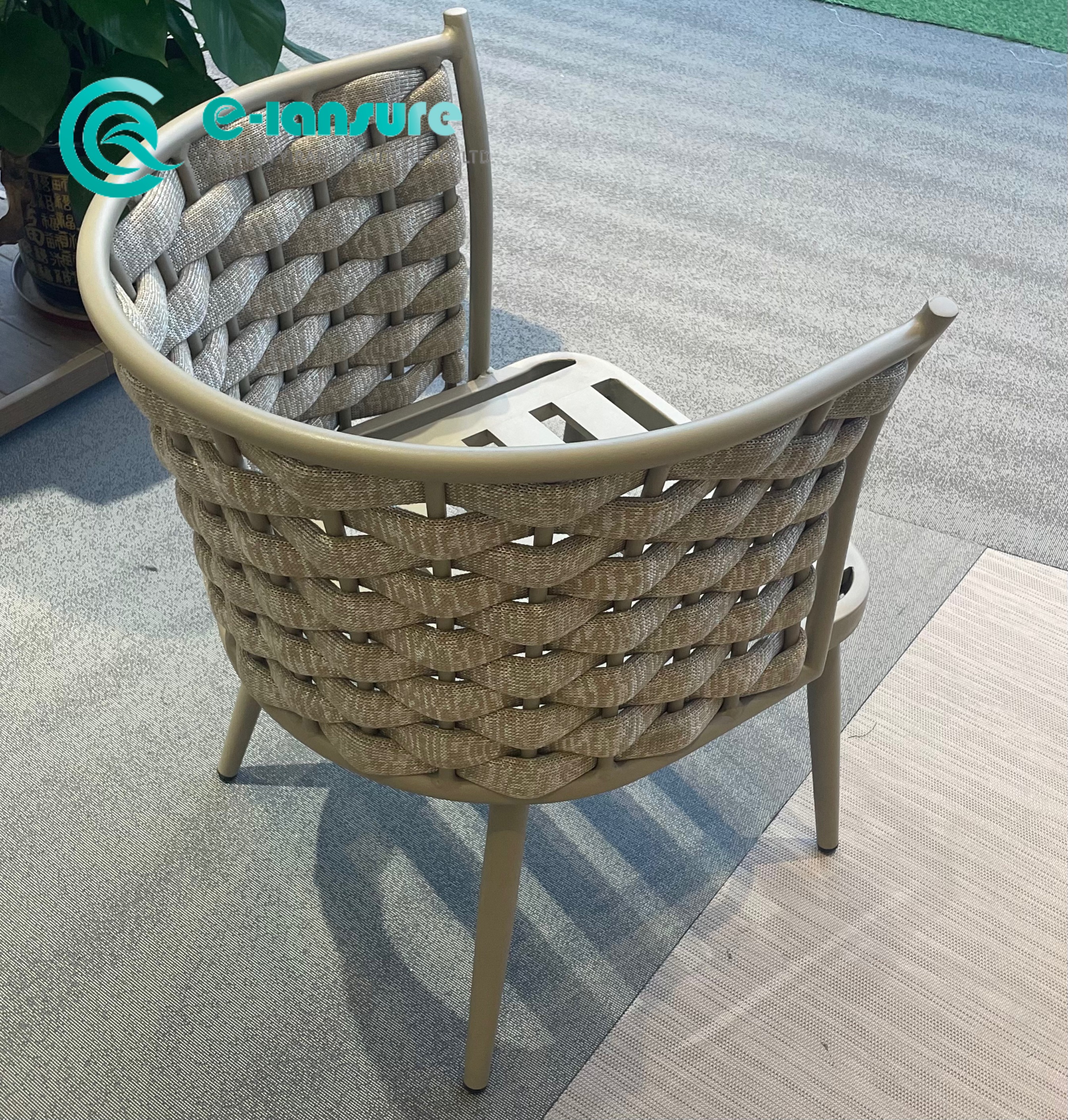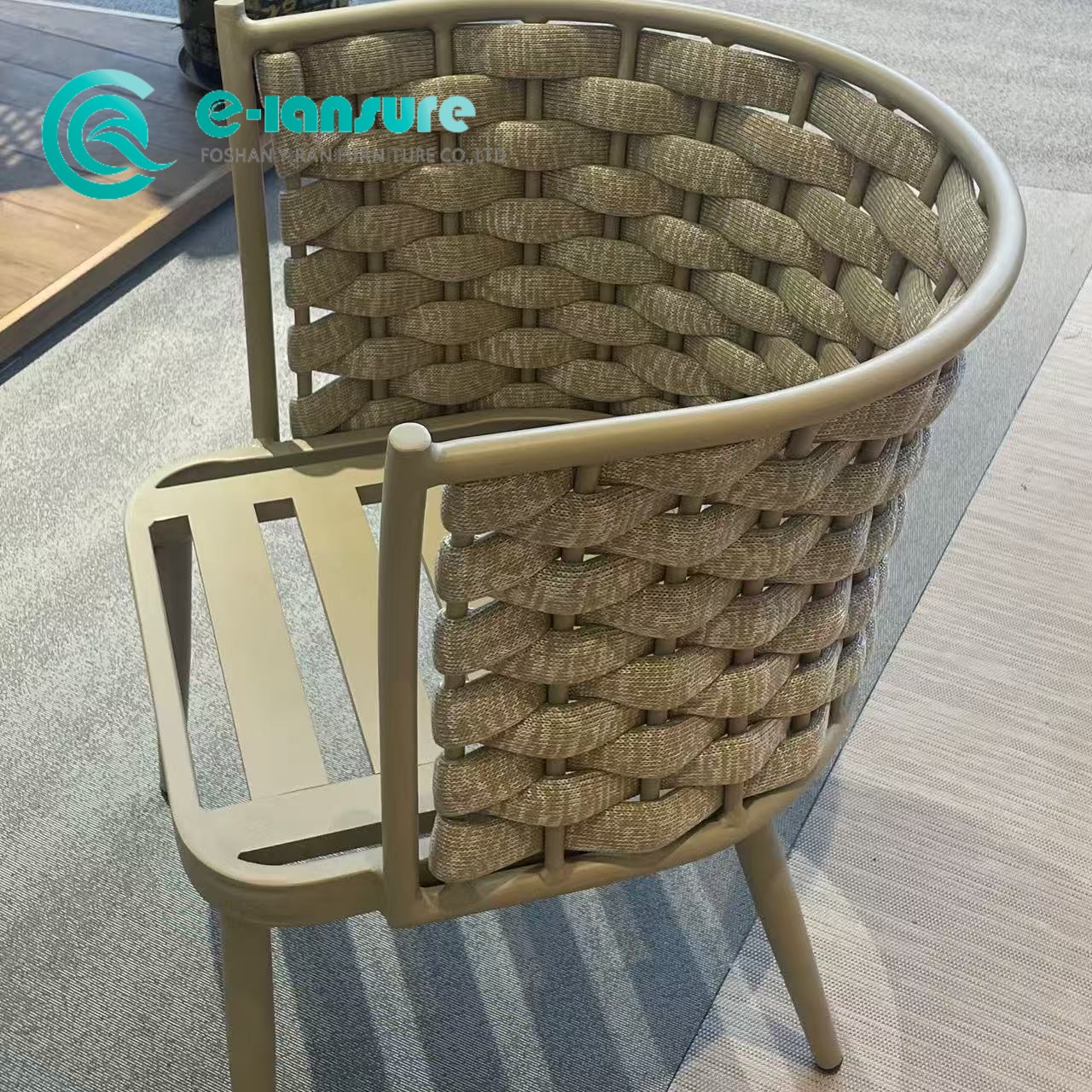 Αναβαθμίστε την εμπειρία φαγητού σας σε εξωτερικούς χώρους με την κομψή καρέκλα φαγητού μας από υφαντό σχοινί. Αυτή η καρέκλα τραπεζαρίας εξωτερικού χώρου συνδυάζει ένα στιβαρό πλαίσιο αλουμινίου με περίπλοκες λεπτομέρειες από υφαντό σχοινί, προσφέροντας έναν τέλειο συνδυασμό αντοχής και στυλ. Η καρέκλα τραπεζαρίας από αλουμίνιο είναι ελαφριά αλλά στιβαρή, καθιστώντας την εύκολη μετακίνηση και αναδιάταξη ανάλογα με τις ανάγκες. Η ευέλικτη σχεδίασή του του επιτρέπει να ενσωματώνεται απρόσκοπτα σε διάφορες ρυθμίσεις, είτε πρόκειται για ένα άνετο αίθριο σπιτιού, έναν γοητευτικό κήπο εστιατορίου ή ένα γαλήνιο καταφύγιο στην πίσω αυλή.