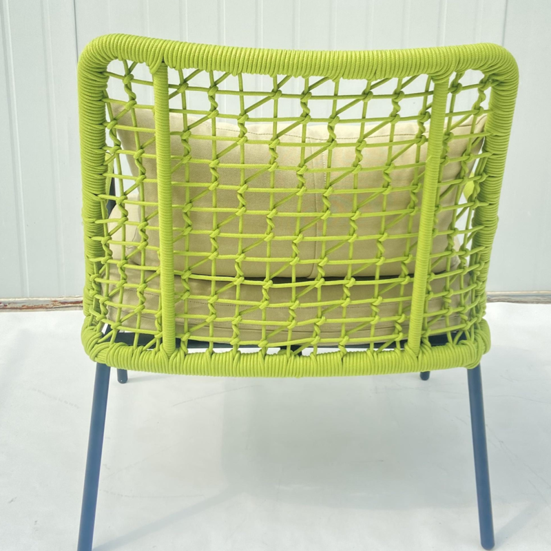 Rohelisest köiest kootud õues paiknev patjadega lamamistool on stiilne ja mugav täiendus igale õues lõõgastusruumile.