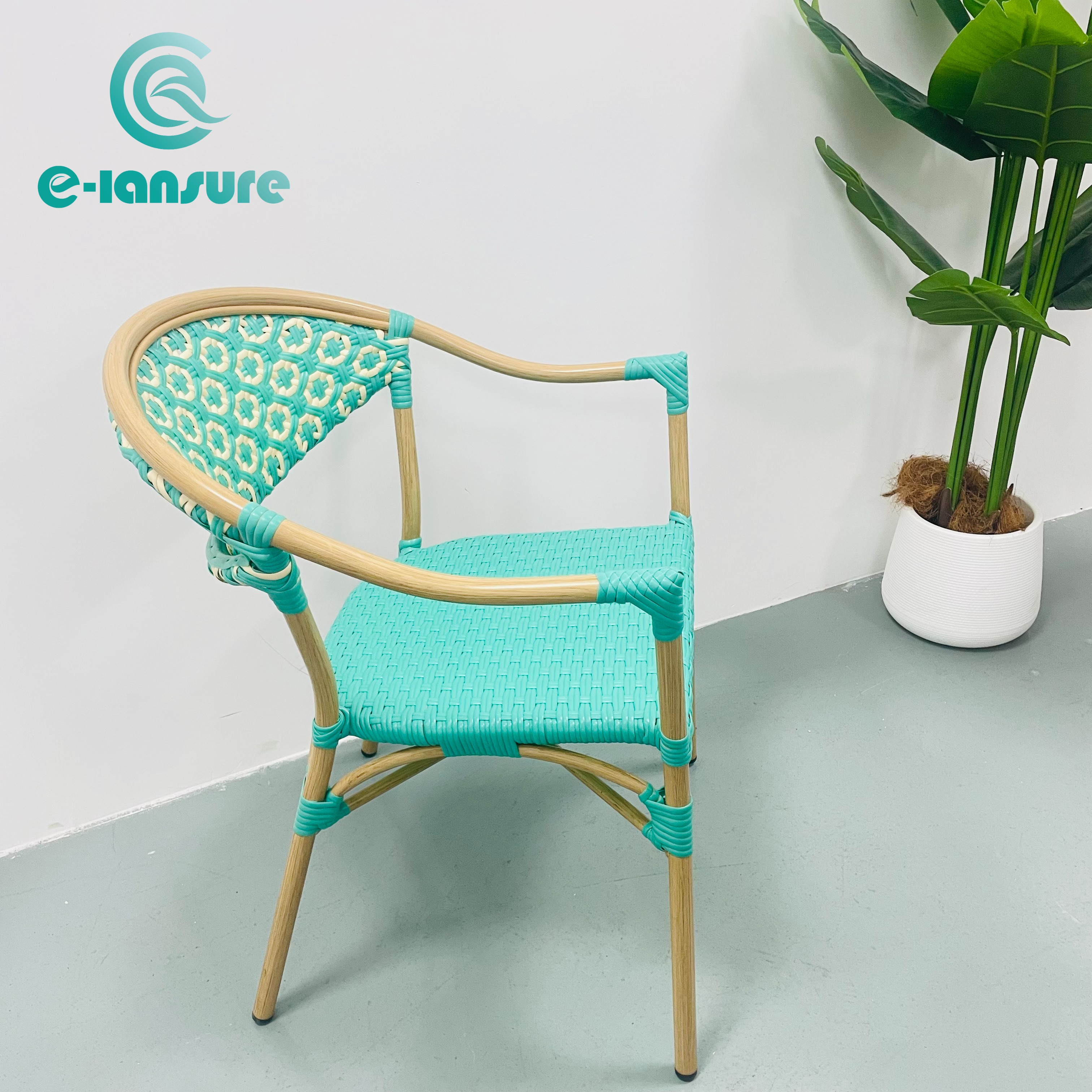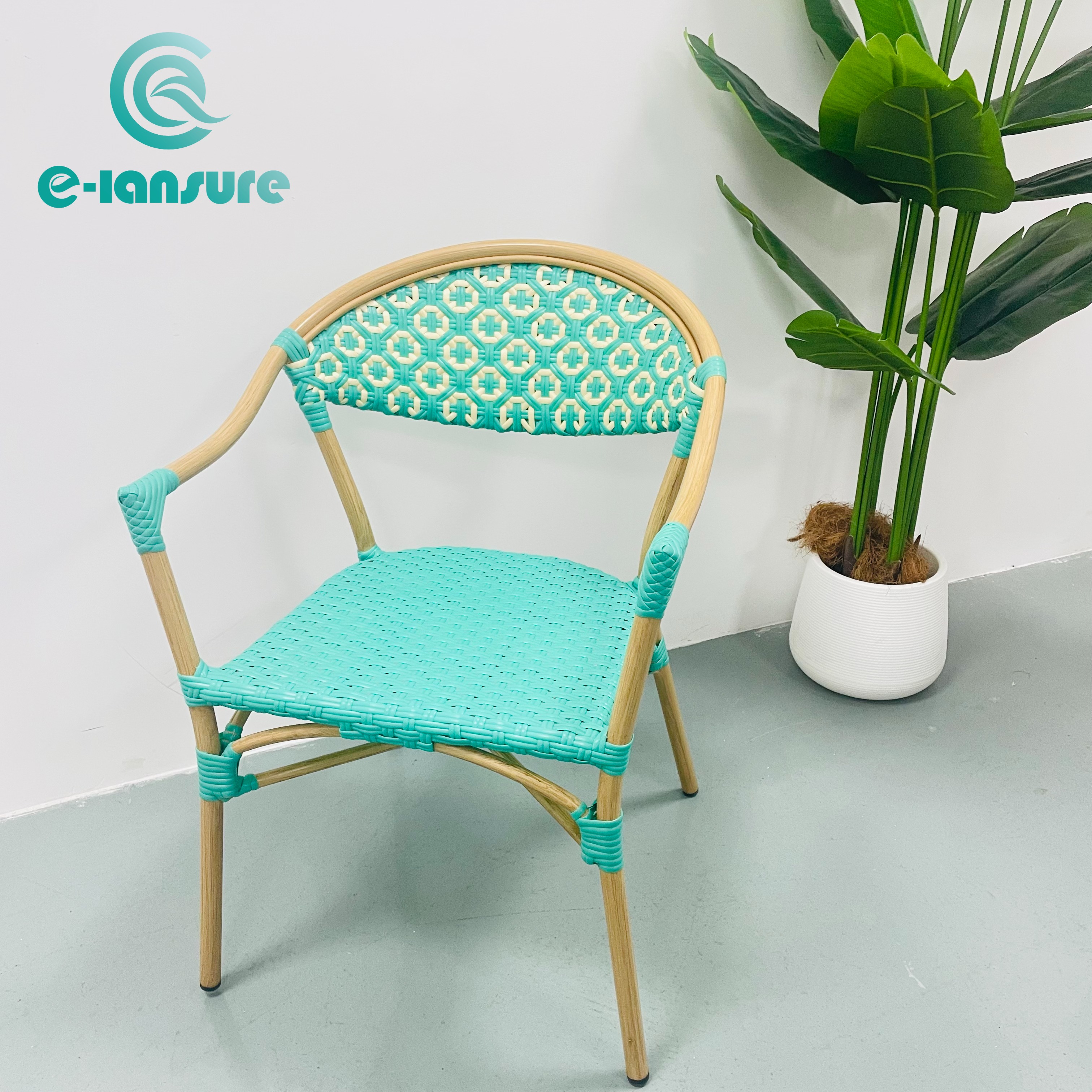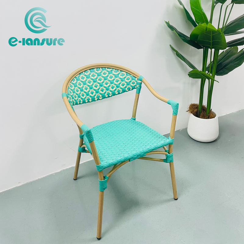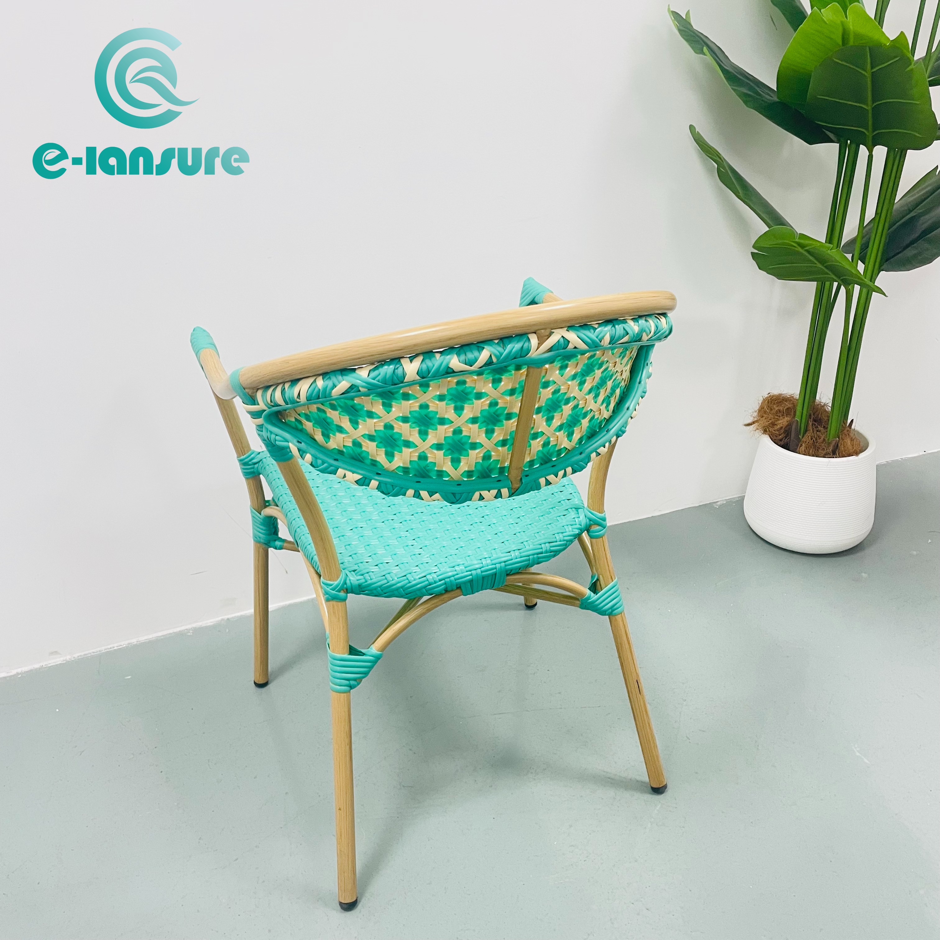 パティオレストランや屋外ダイニングエリアに最適な、シンプルなスタイルの屋外アルミフレームライトグリーンラタンチェアをご紹介します。この椅子は耐久性とスタイルを兼ね備えており、風雨に耐えるように作られた頑丈なアルミニウムフレームを備えています。ライトグリーンの籐素材は、屋外スペースにエレガントなタッチを加えると同時に、ゲストに快適さを提供します。