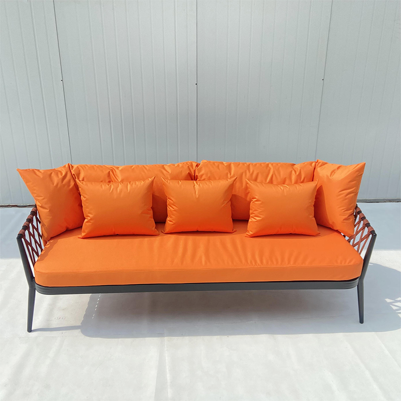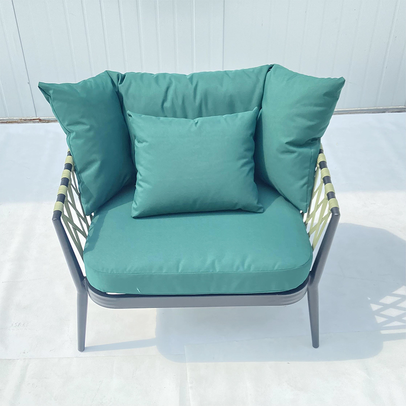 Concluindo, o conjunto de sofás com estrutura de alumínio cinza em corda tecida para exterior é uma escolha elegante e confortável para qualquer espaço ao ar livre, perfeito para relaxar e desfrutar do ar livre.